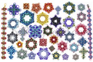 Make your own medium size owl! This guy is about 1.25" tall. His wings are black anodized aluminum medium scales. This kit will make 1 owl in saw cut anodized aluminum rings in matte finish titanium gray and pink. His eyes are sky blue outside with titanium gray inside. This is an intermediate level project.